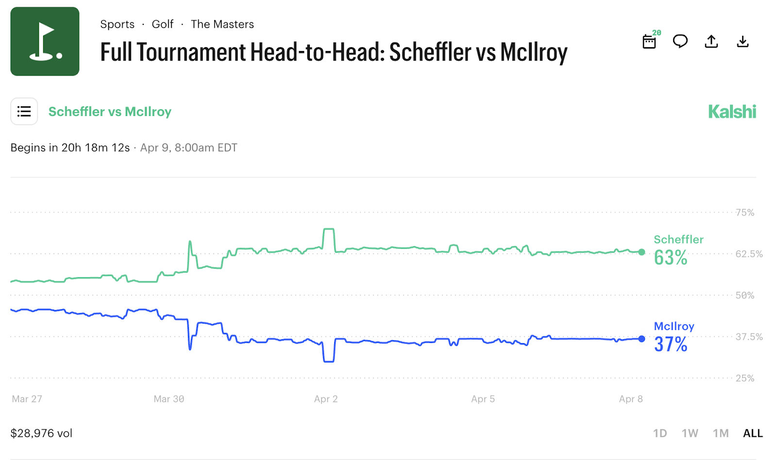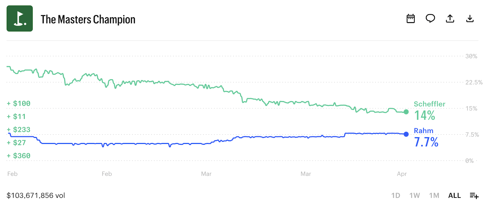 The Masters Tournament Champion market on Kalshi crossed $100 million in volume 24 hours before the opening shot of the tournament.