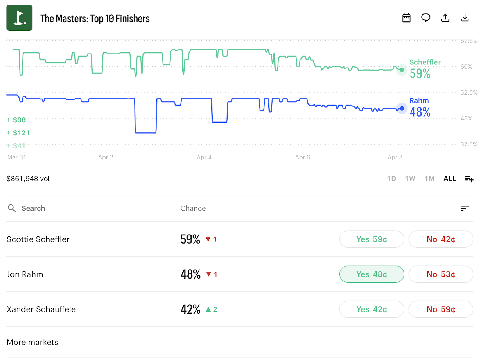 Turns out, that's where the real action is, and Tiger - who was trading at less than 1 cent to win - was never going to move it. He wasn't a contender. He was a nostalgia contract. The crowd loved him enough to trade on his attendance, but not a single dollar of serious money thought he was winning a sixth green jacket at 50 years old with a surgically reconstructed spine.