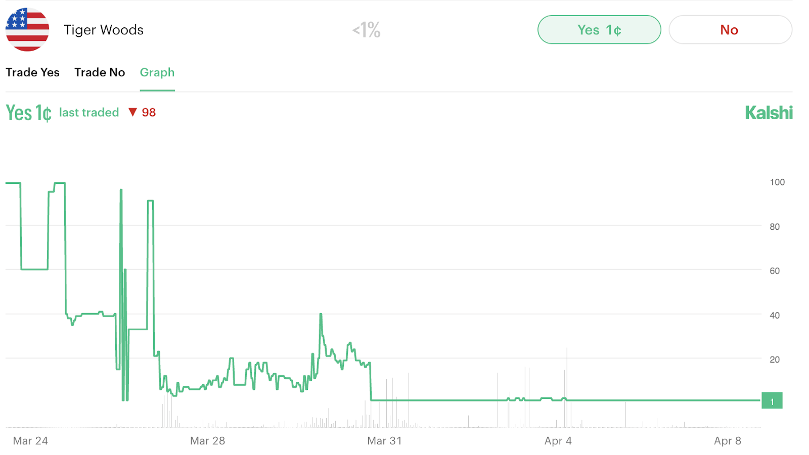 Then on March 31, Woods announced he was stepping away from golf to seek treatment. The contract landed at 1 cent. Done.