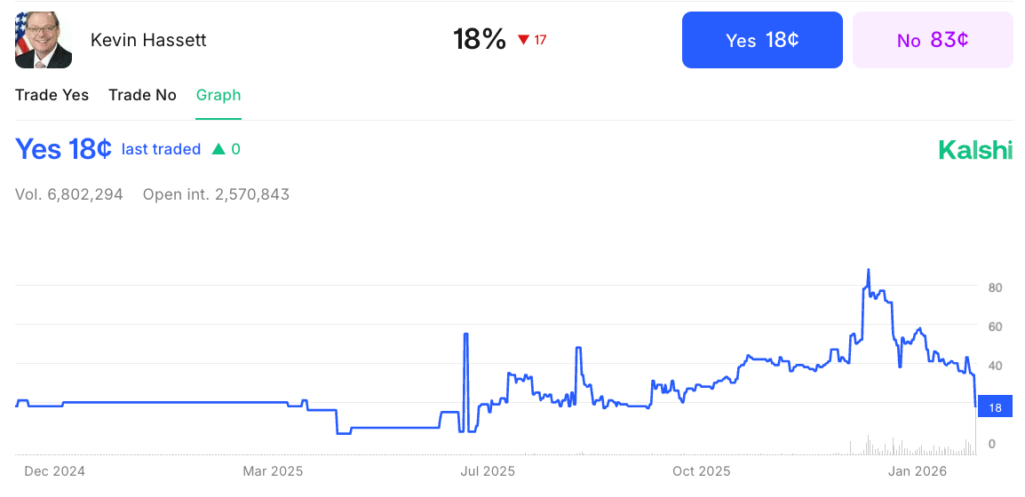 Hassett now shows only an 18% chance of heading the central bank. Notably, he was still the market favorite as recently as January 2, reflecting a 41.5% predicted possibility on Kalshi.