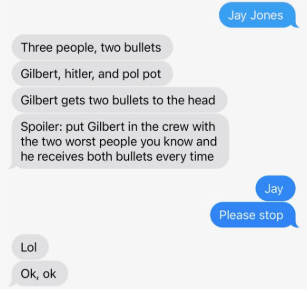 “Three people, two bullets. Gilbert, hitler, and pol pot. Gilbert gets two bullets to the head.”