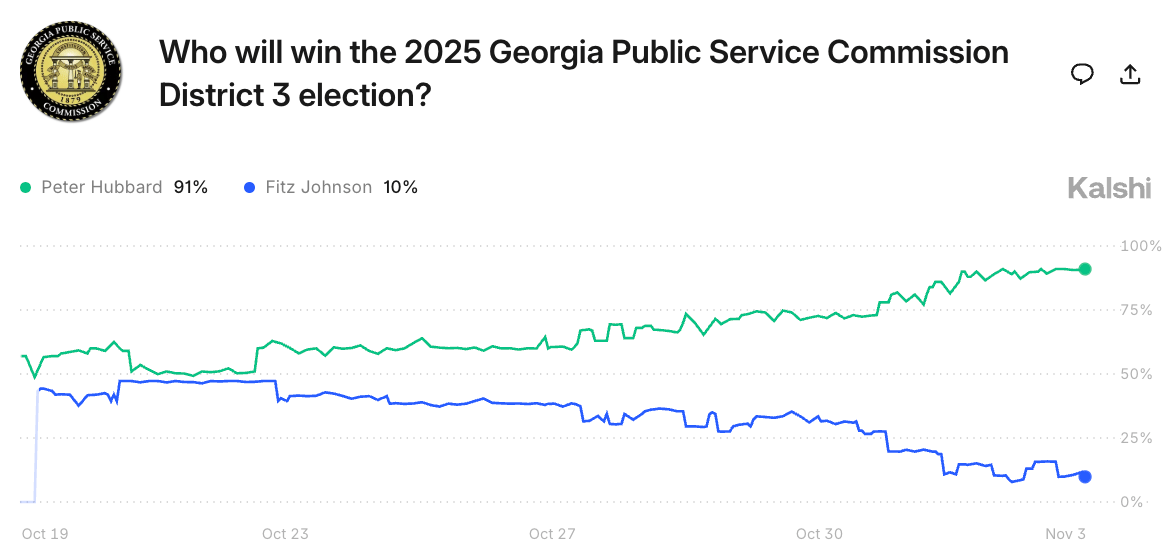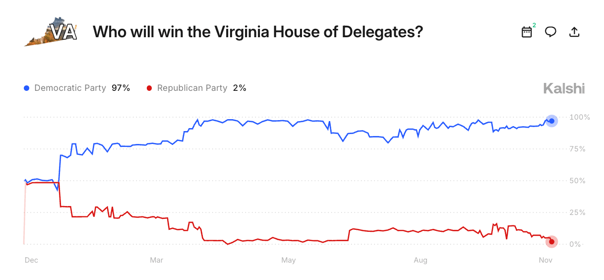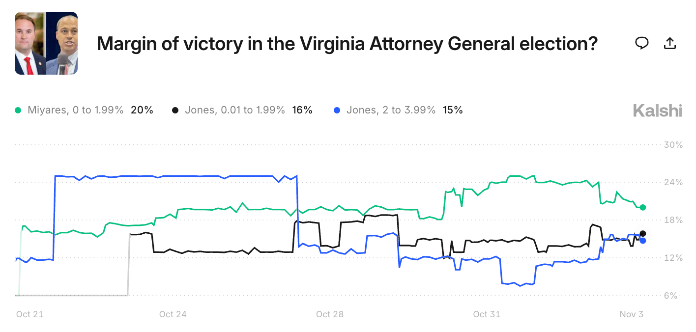 Jones’ odds immediately plummeted in our market, and nearly all polling released after the scandal showed him falling behind Miyares. But in this final week, as undecided voters make up their minds, there are some signs that this race is headed for a photo finish. A pair of new polls show Jones inching ahead of Miyares again, he appeared at a rally with Spanberger and former President Obama to rally the Democratic base, and his odds have surged above 40% once more. This election is the latest to test voters’ willingness to vote for the other party when their own candidate faces a large scandal, and it remains unclear how many Virginians who vote for other Democrats will abandon Jones. If Spanberger wins by a landslide, it may yet be enough to drag Jones over the finish line, for better or worse.