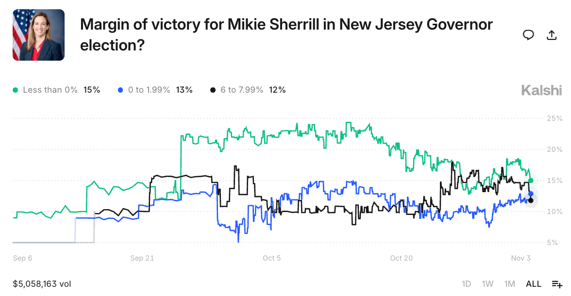 Now, traders still forecast a likely Sherrill victory, but something to watch will be her margin of victory. Can she match Harris’ margin of just under 6%, or will the race be a nail-biter the same way it was four years ago? On the other hand, if Sherrill can significantly outrun Harris, perhaps even winning by double digits, it could indicate that Trump’s gains in the northeastern states may be difficult for the GOP to replicate without him on the ticket. New Jersey is also home to many Hispanic communities that stampeded over 30 points toward Trump between 2020 and 2024 – some of which can be found in counties like Passaic. Democratic margins in these towns and counties will also provide key indicators as to the party’s fortunes in key battleground districts and states in 2026.