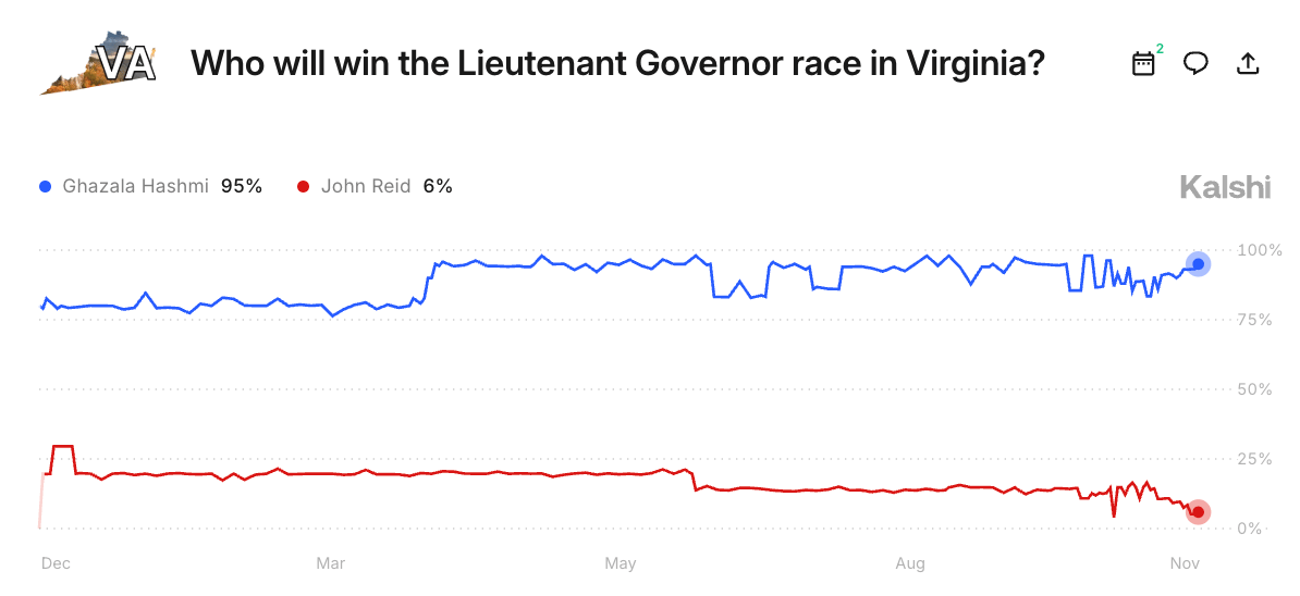 Since then, this race has been relatively quiet, with the exception of some controversy that swirled around John Reid’s social media usage in the spring and early summer. Hashmi has repeatedly outraised Reid and has maintained a consistent lead over him in the polls; although the lead varies, the data indicates she will slightly underperform Spanberger’s margin. Traders also give Hashmi over a 90% chance of winning the election, with a larger Spanberger victory likely to also help Hashmi prevail.