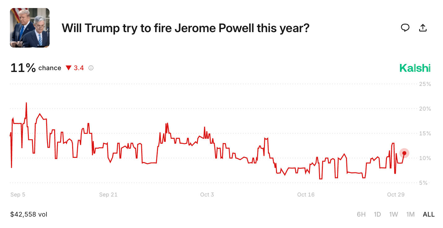 A related Kalshi market tracking whether President Trump will try to fire Jerome Powell this year shows little change, dipping to 11%, down about 3 points on the day.