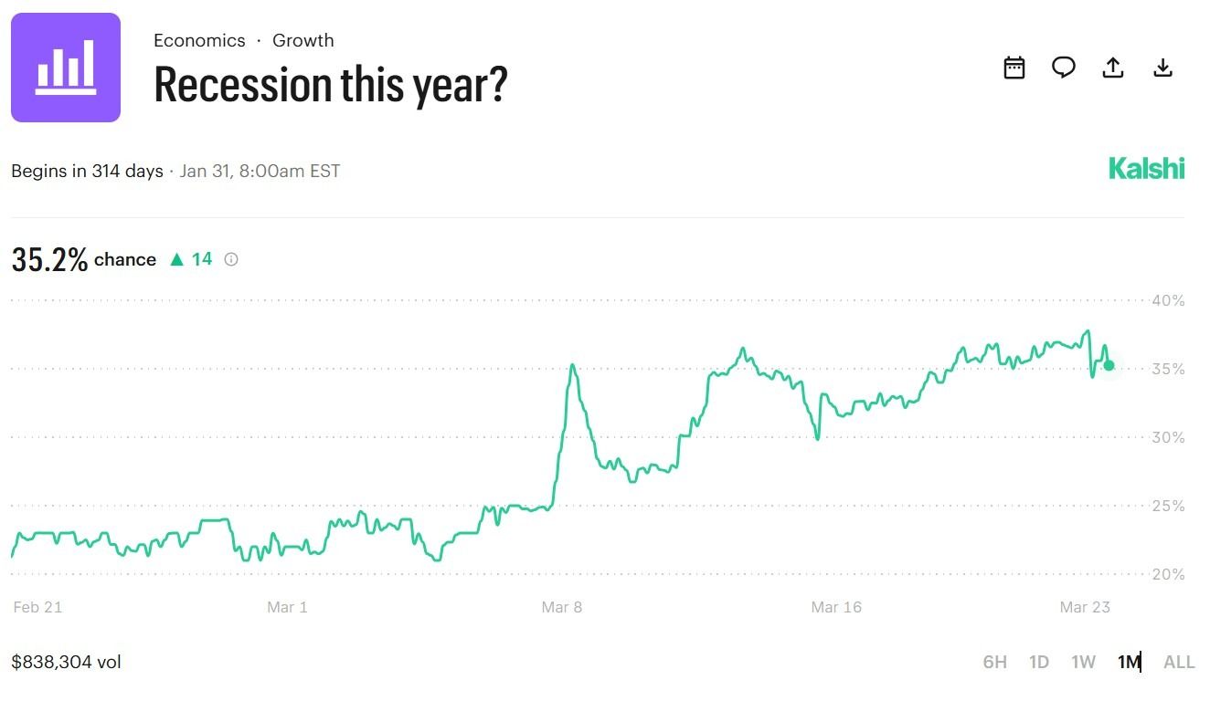 Kalshi traders almost doubled the odds of a recession this month alone.