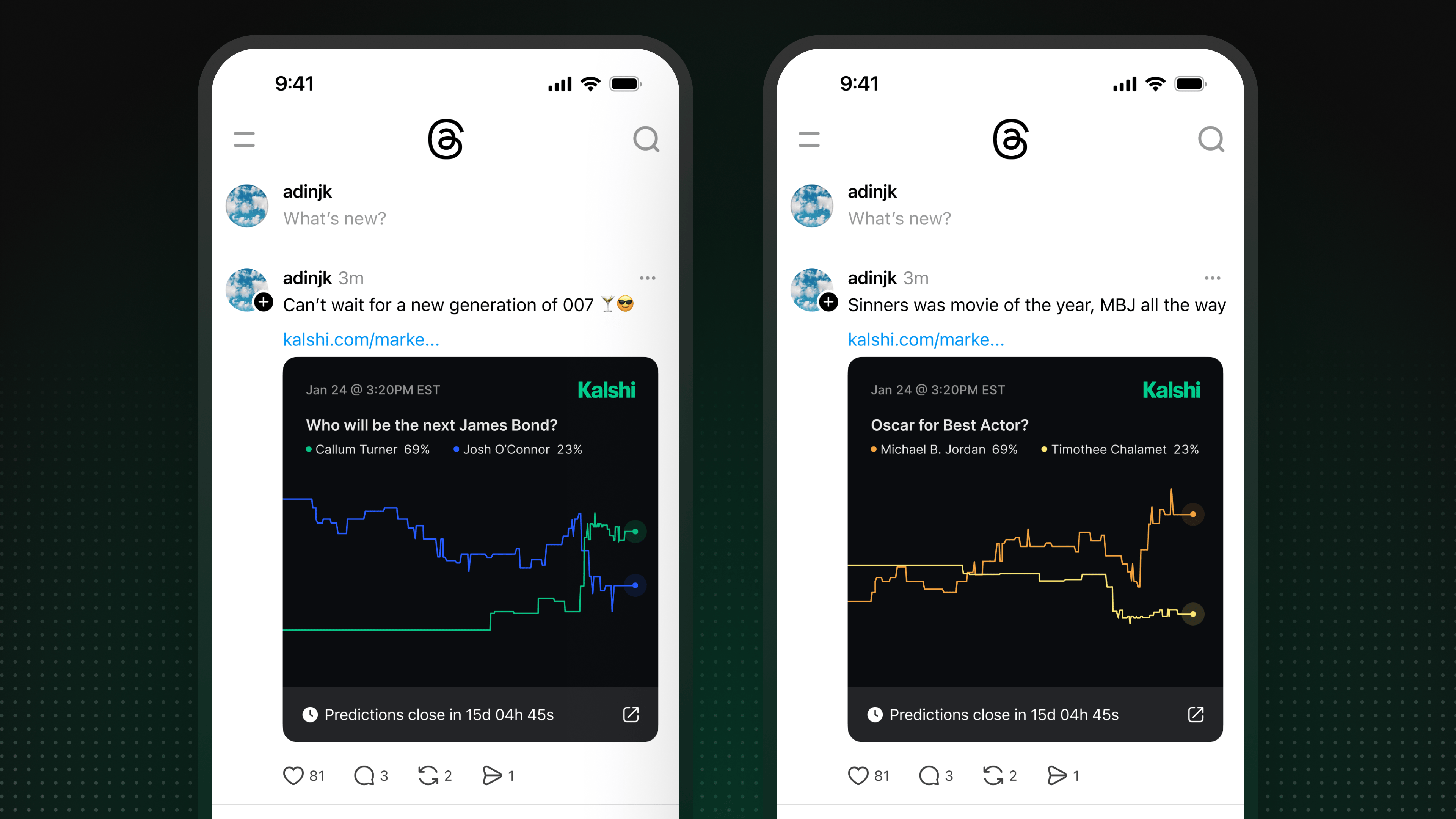 If you’re on Kalshi’s app and you want to share and talk about the odds of something happening, like who’s going to win Best Picture or which reality TV character is going to go home, simply click on the share icon and post your take to Threads: